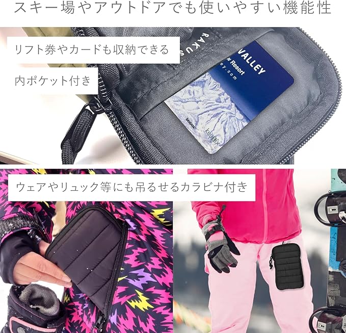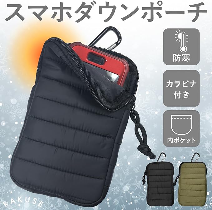 ダウンポーチ スマホ スキー場用防寒ポーチ ブラック/カーキ