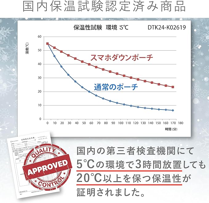 中綿のキルティング素材を使用しているため、携帯電話やカメラなどの電子機器を寒さから守ります。