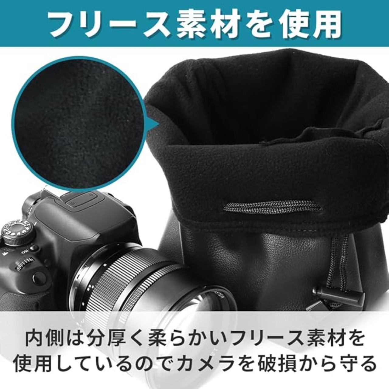表面の生地には撮影現場が雨でもカメラを水没から守れるよう、防水性に優れたPUレザーを採用しました。内側は柔らかなフリースで覆われているため、カメラが擦れて傷付く心配はありません。