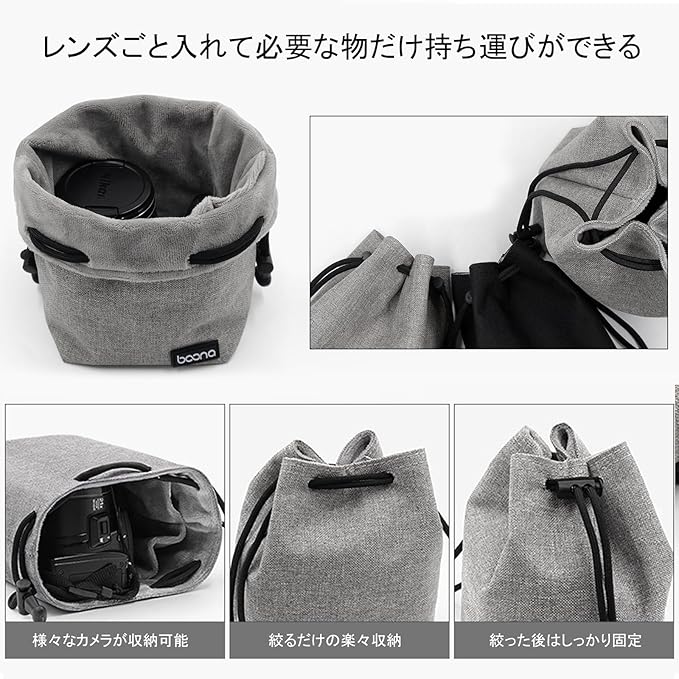 大切なカメラをしっかり保護して収納! 小型で持ち運びに便利な、巾着袋のカメラ収納ポーチ。クッション性のある厚手クッションが下に敷いてあります。裏地は柔らかい起毛素材の二重構造で大切なカメラを衝撃から守ります。突然の雨にも対応の撥水効果抜群の防水生地を使用。巾着タイプで開け閉めも簡単。コードストッパー付きでしっかりと口を閉じられるため、カメラの飛び出しも防ぎ持ち運ぶことができます。