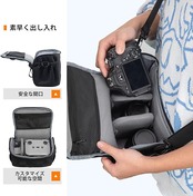 【フレキシブルな内部収納】25*14*17cm、350g、5L 移動可能な間仕切り板が付いており、カメラやレンズのサイズに合わせて調節できるカメラショルダーバッグです。カメラ1台とレンズ2本を収納可能.