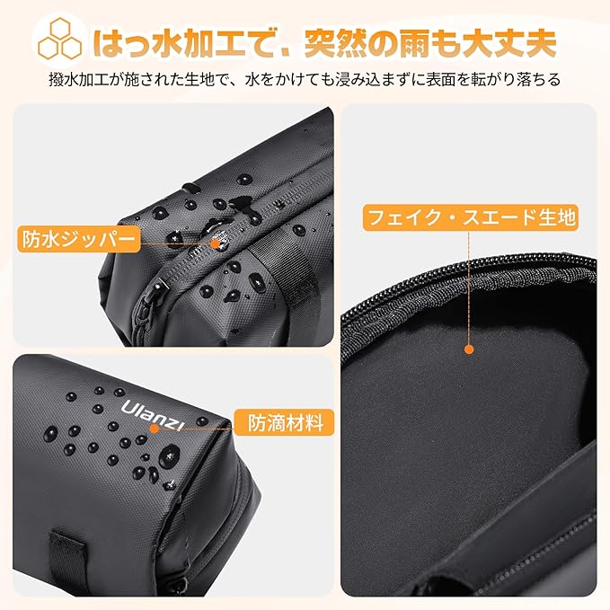 【高品質素材】 保護ケースの外殻は高品質の防水生地で作られており、キズ、水しぶきなどから保護し、旅行や保管中の安心感を提供します。裏地には衝撃を吸収し、カメラを衝撃から守るスエードライニング素材を使用しています。バッグの開閉はスムーズに行える防撥水ジッパー仕様で、アクセサリーやカメラへの出し入れが簡単です。