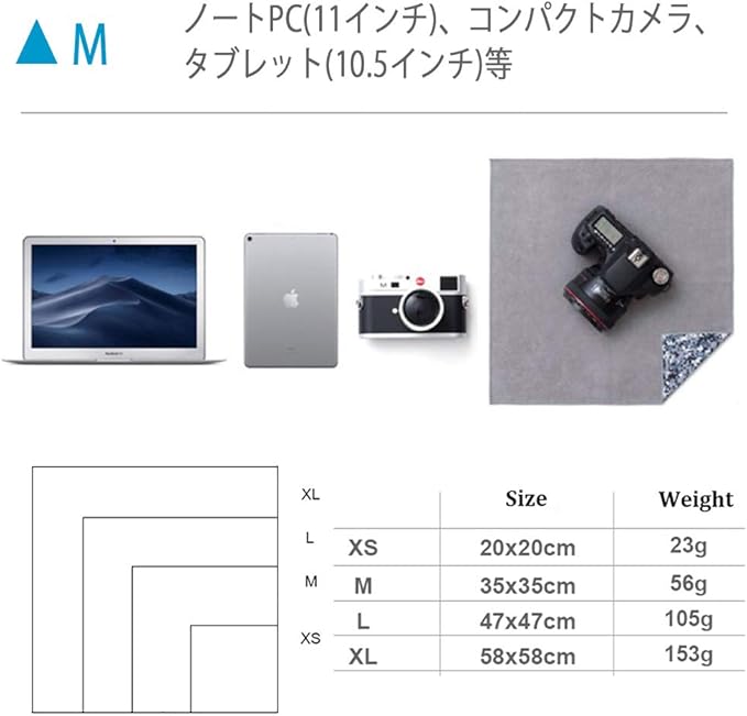 ✅ M サイズ:350 x 350 [mm] ノートPC(11インチ)、コンパクトカメラ、タブレット(10.5インチ)に最適。くっついて包めるのでインナーバッグとしても使用可能。