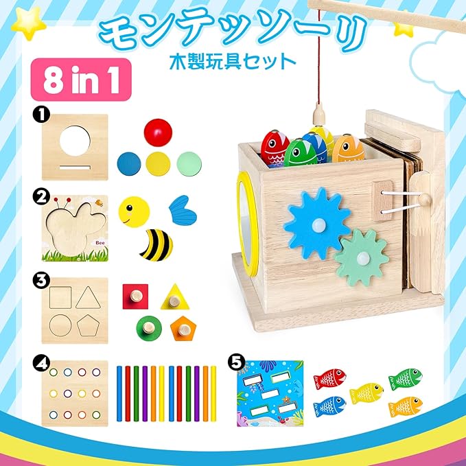 【8-in-1 木製ボックス】モンテッソーリ教育に基づいた当社のプレイキットには、形合わせと積み上げ、色合わせ棒落としゲーム、釣りゲーム、コインバンク、ボール落としゲーム、回転ギア、模擬時計、形合わせゲームなど、8つの感覚ゲームが1つのお得なセットに詰まっています。様々な年齢の幼児にお楽しみいただける素晴らしいプレイキットです。
