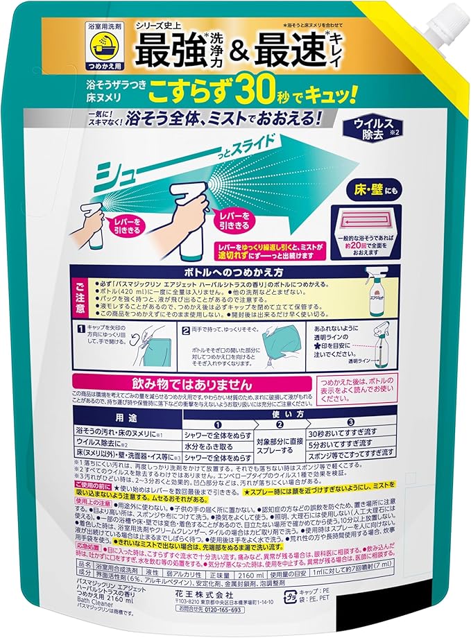 浴そうのザラつきやヌルつき、床のヌメリまでこすらず30秒でキュッ!・一気に!スキマなく!浴そう全体、ミストでおおえる!・床や壁にも使える・イスや洗面器の石鹸カスもラクラク落ちる・ウイルス除去も(すべてのウイルスを除去するわけではありません)・ハーバルシトラスの香り