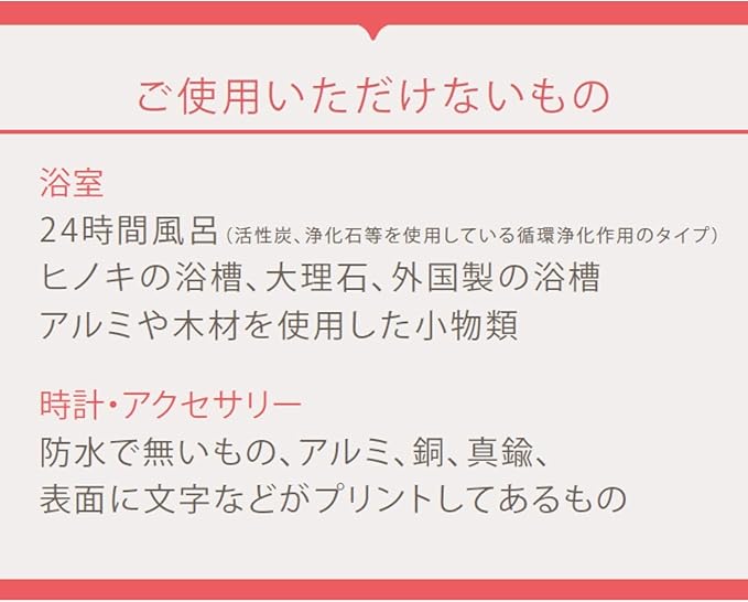 商品用途・使用方法 風呂釜の洗浄(バランス釜、追い焚きできる釜)、タイル、タイルの目地、浴槽、浴室備品(洗面器、風呂椅子など)、水栓金具等の洗浄、洗濯槽、アクセサリー類