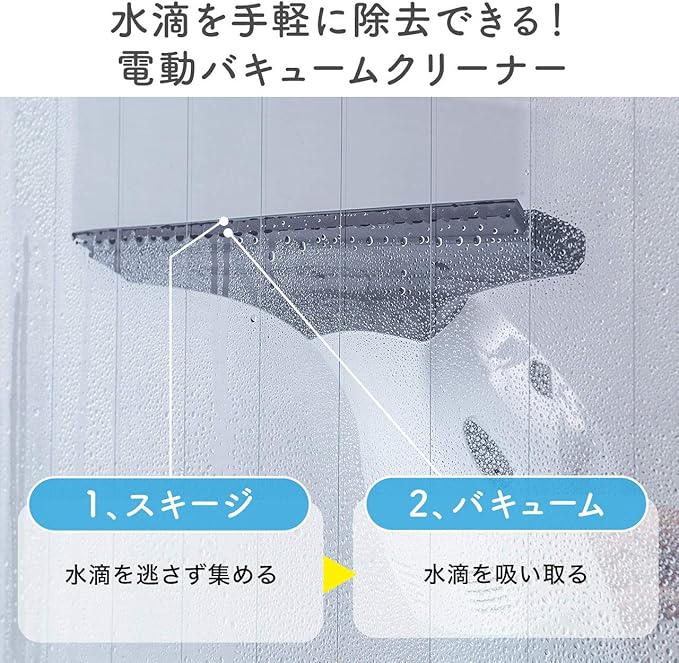 水滴を手軽に除去できる、電動窓ガラスバキュームクリーナーです。窓やガラスなどを手軽で簡単におそうじできます。