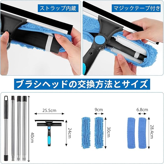 取り外し可能な窓掃除道具:この窓掃除ブラシには2つの超吸水性の交換用クリーニングブラシが付属しており、取り付けが簡単で、使わない時、分解しても収納も簡単です。簡単に取り外して洗濯機で洗うことができます