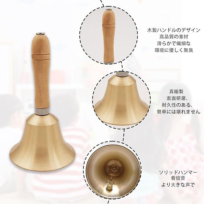 【手振りベル】精巧に作られたハンドベルです。シンプルなデザイン、きれいな音色、見た目がおしゃれです。ハンドベルとしてもご使用でき、楽器としても使えます。 【高品質】高品質の銅と木製のハンドベルは光沢があり、研磨仕上げ、色褪せにくく、耐久性があります。快適で握りやすいこのハンドベルはとても魅力的です。【操作が簡単】使い方は簡単、鐘を繰り返し振るだけで、ベルが大きくはっきりとした音を出してくれます。夕食、クラス、ゲーム、ペットのトレーニング、誰かの目覚めなどのベルとしてもオススメ。 【用途が広い】レストラン、ホテル、店舗などでの呼び出しベルとして使用できます。くじ引き、抽選会、行事、子ども会、大当たり、お祭りなどのイベントにも大活躍です。 【セット内容】手振りベル1個入っています。サイズ:約8cm 15cm。伝統的なハンドベルは、ご家族やご友人へのプレゼントにも最適です。
