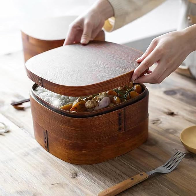 【木製重箱 】天然木(杉)+天然塗り (取り外し可能な十字仕切り付き) 木製のお弁当箱がご飯の余分な水分を吸収し、時間が経って水分が蒸発してきた時にお弁当箱の水分がご飯に戻るため、ご飯が固くならずいつまでもふっくらしています。使い込むほどに風格をます逸品です。