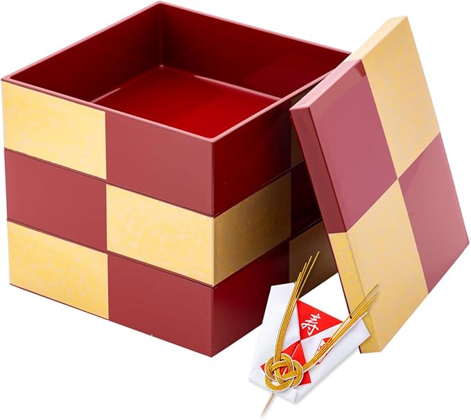 重箱 三段重 市松模様 朱金 五寸 外寸15 15 15cm 容量784ml 3 日本製 (飾り熨斗 1つき)