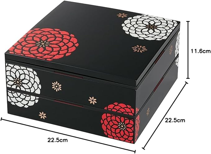 黒・赤をベースに配色したシンプルでモダン、大きな花の模様が美しい華やかなお重箱です。