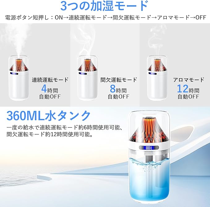 加湿器 卓上 小型 360ML 【2025新 Type-C充電式】 超音波 コードレス 火山型7色RGBライト搭載 12時間連続使用 ワンルームかしつ 空焚き防止 次亜塩素酸水/アロマ対応 ミニ加湿き 冬場乾燥/肌荒れ対策 寝室/オフィス/車/学校用 省エネ 日本語取扱説明書付き (火山型ホワイト)