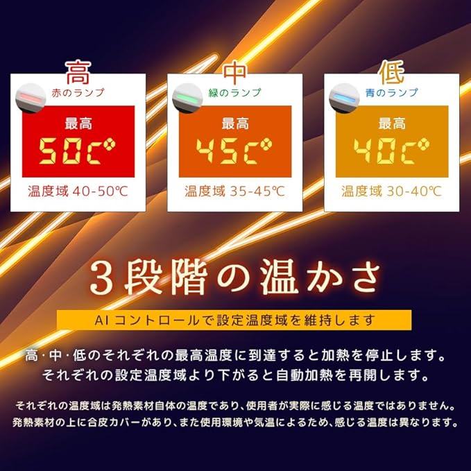 【使用上の注意】こちらの商品はAIコントロールで設定温度を維持します。高(約55℃)・中(45℃)・低(35℃)のそれぞれの最高温度に到達すると加熱を停止します。それぞれの一定の温度より下がると自動加熱を再開します。*それぞれの温度は発熱素材自体の温度であり、使用者が実際に感じる温度ではありません。発熱素材の上に合皮カバーがあり、また使用環境や気温によるため、感じる温度は異なります。