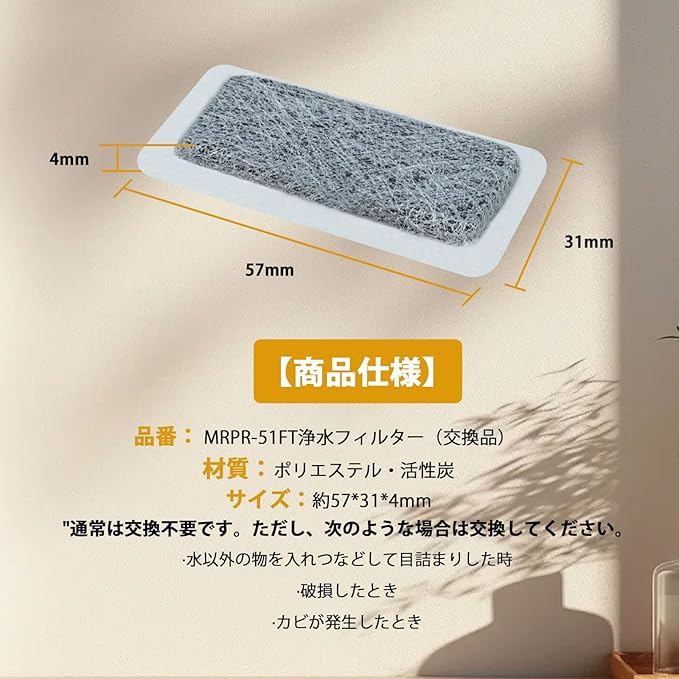 【商品仕様】 MRPR-51FT 冷蔵庫用 給水タンクフィルター (交換品)材質:ポリエステル・活性炭 サイズ:約57*31*4mm 機能:水道水をろ過して水中に含まれる不純物を除去する。カルキ臭を低減する。