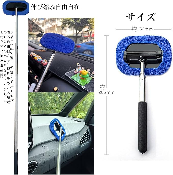 車窓拭き すべてのコーナーに届く:調整長さ1mのロング設計:手が届きにくいフロントガラスの奥や大型車の内窓も、らくらく車内清掃。薄型ヘッドで傾斜のある窓にもしっかりフィット。車の窓拭きストレスから解放され、隅々までクリアな視界を確保できます。