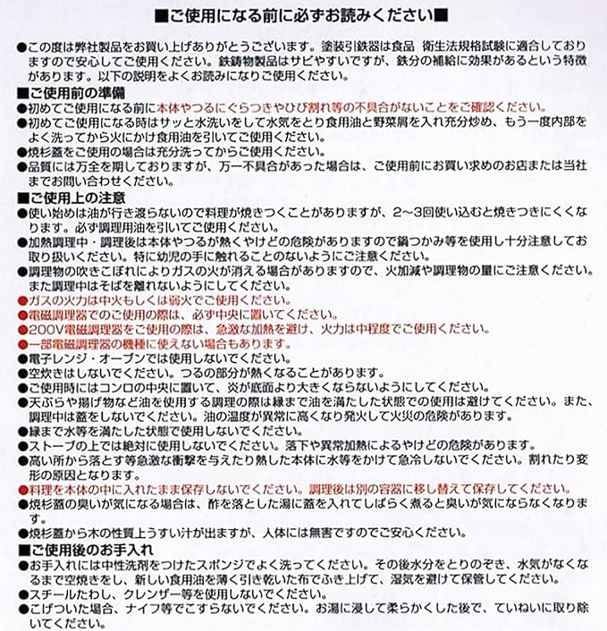 ※使用後のお手入れ ・使用後は中性洗剤でよく洗ってください。その後空焼きをし食用油を薄く引いてください ・食器洗い乾燥機は使用しないでください ※鍋の塗装が剥がれる場合がございますが、塗装は安全な樹脂で体内に摂取されても吸収されず排出される為影響はございません。また剥がれた部分はスポンジでこすり落としてください(処置方法の詳細は説明書などをお読みくださいませ)