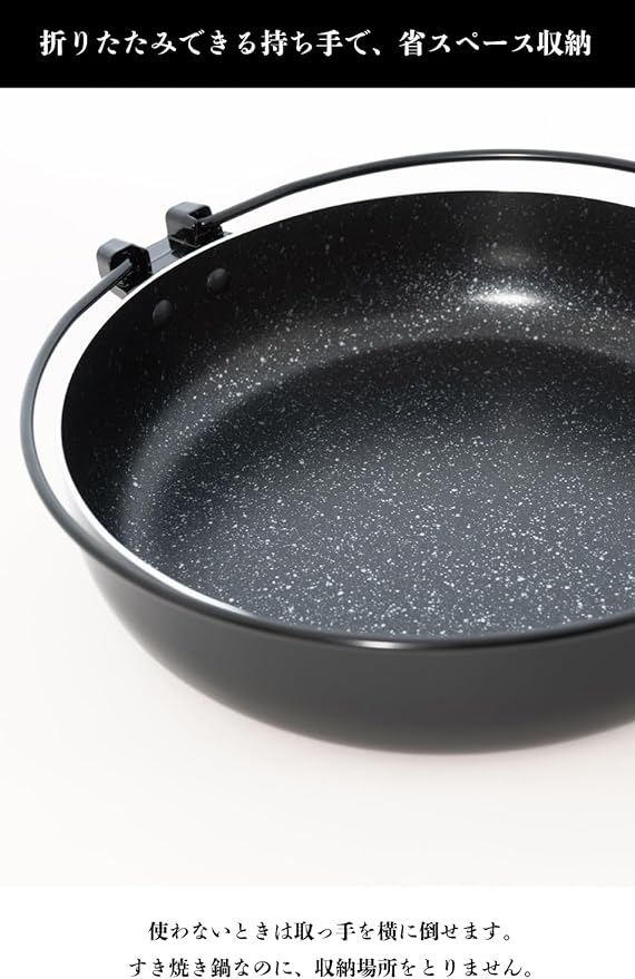 すき焼き鍋 26cm IH対応 ガス火対応 マーブルコーティング 軽量アルミ製 ガラス蓋付き 折りたたみ取っ手 省スペース収納 家族用鍋 しゃぶしゃぶ 寄せ鍋 卓上鍋