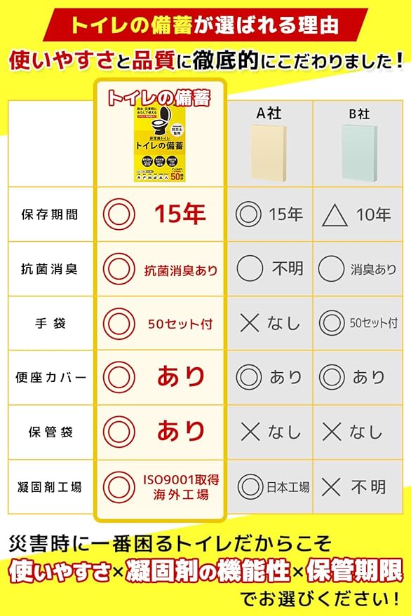 ✅【セット内容 /HOT保証】1箱に 凝固剤 50袋、汚物処理袋 50枚、便座カバー 3枚、防臭袋 5枚、衛生手袋 50枚【HOT保証】本製品は日本企画の日本限定商品です。お電話でのお問合せも日本人スタッフが対応させていただきます。不具合、故障がありましたら無償で交換対応させていただきますので お気軽にお問い合わせください。