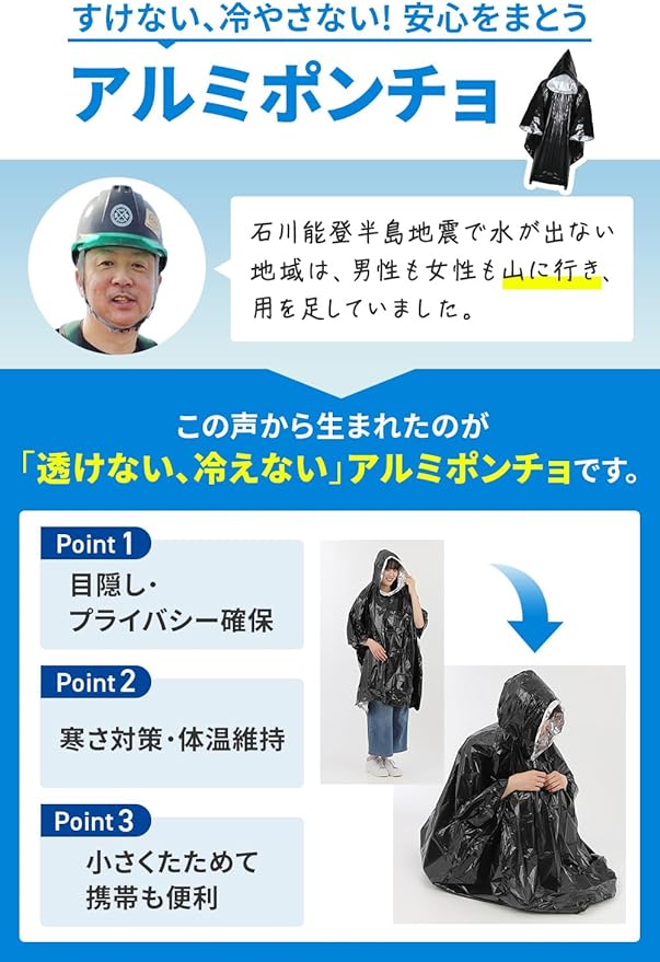 【透けないアルミポンチョ】断水時には女性や子どもも屋外で用を足さざるを得なかったという声も。プライバシー確保と寒さ対策を同時にできるアルミポンチョをセットにしています。