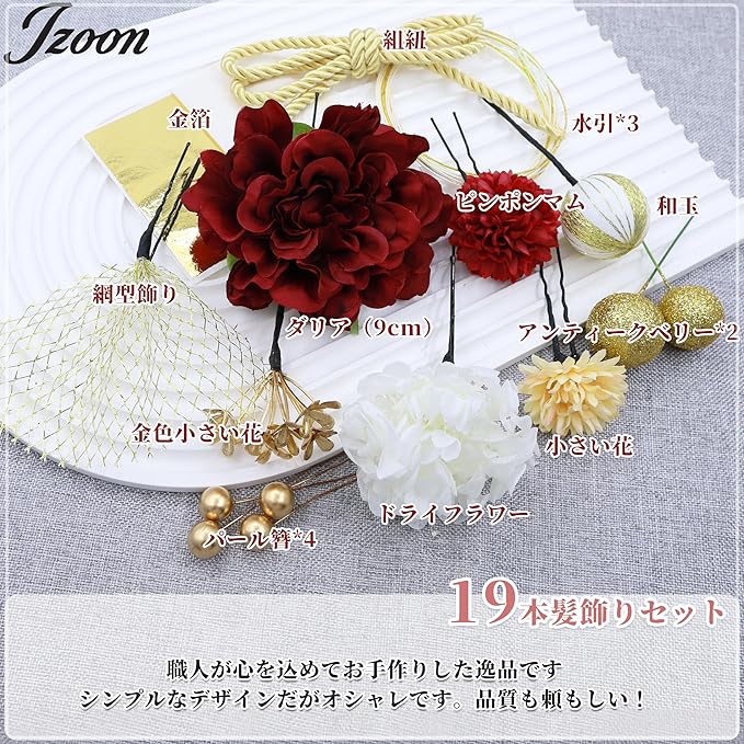 [JZOON] 成人式 髪飾り【10色展開】 ドライフラワー ダリア あじさい かすみ草 造花飾り ヘアアクセサリー 和玉 赤 ゴールド 水引 ヘッドパーツ 振袖 着物 卒業式 七五三 浴衣 袴 結婚式用 手作り 専用ケース付き Y3330