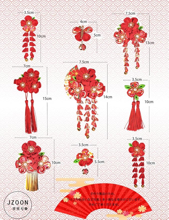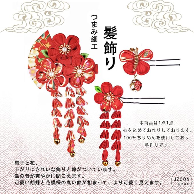 [JZOON] 髪飾り3点セット 成人式 七五三 浴衣 袴 着物 振袖 和装 つまみ細工 花 卒業式 結婚式 鈴付き 手作り 赤 青 紫 ピンク 白 5色全15選