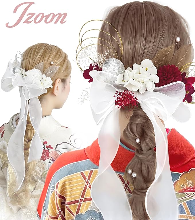 【デザイン】和のテイストとモダンな美しさを融合。大きなリボンと花飾りの組み合わせで、華やかさと上品さを演出します。