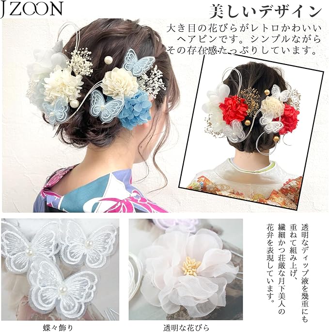 [JZOON] 髪飾り 成人式 水引 ドライフラワー 蝶々飾り 紫陽花 ソーラーローズ 人気 ヘアアクセサリー 前撮り 振袖 卒業式 結婚式 和装 袴 着物 浴衣に ブライダル 花嫁 ホワイト 赤 18点セット Y1700