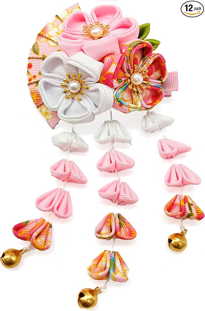 [JZOON] 髪飾り 成人式 七五三 浴衣 袴 着物 振袖 和装 つまみ細工 花 卒業式 結婚式 鈴付き 手作り 赤 青 紫 ピンク グリーン 5色