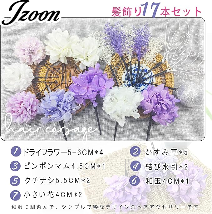 [JZOON] 髪飾り ヘアアクセサリー ドライフラワー ピンポンマム クチナシ 紫陽花 カスミソウ お花 和玉 結び水引 結婚式 入学式 卒業式 成人式 着物 浴衣 袴 振袖 洋服 和風 上品 華やか 立体感 おしゃれ Y1120