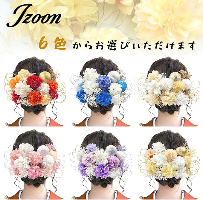 【満開したお花】それぞれ違う色をバランスよく組み合わさった6色をご用意しております。どれもお花がたくさん咲いて特別な日の装いに華を添えます。花びらは立体感があり、風の中で軽く揺れ、穏やかな着物姿にぴったりです。