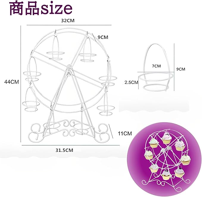 8個のカップケーキや飾りをディスプレイでき、観覧車の部分は、手動で360度回転させることが可能です。 誕生日、結婚式の受付に飾るなど、二次会やパ―ティ・イベント等様々なシーンでご利用頂けます。 ただお皿やテーブルに並べるよりも、観覧車型のディスプレイを使えば、より立体的で華やかな雰囲気になります。写真を撮るための小道具としても便利です。