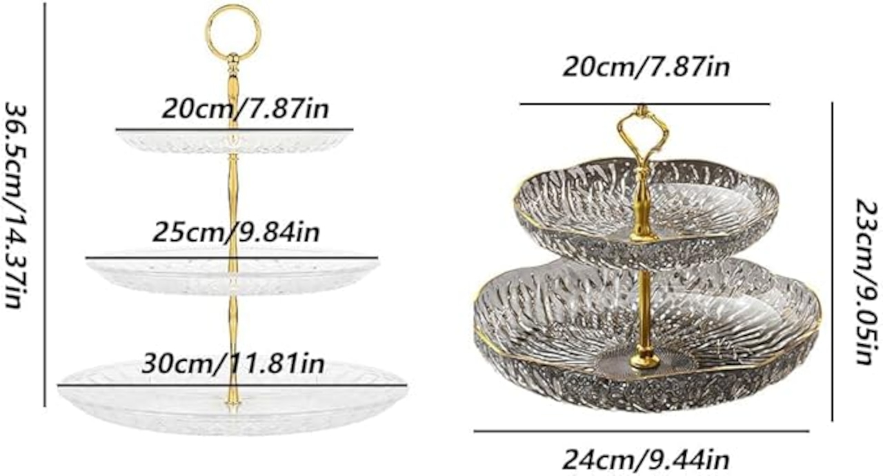 サイズ:24x23cm、プレートの直径:24cm、20cm。透明、透明グレー、透明ゴールドの3色展開。