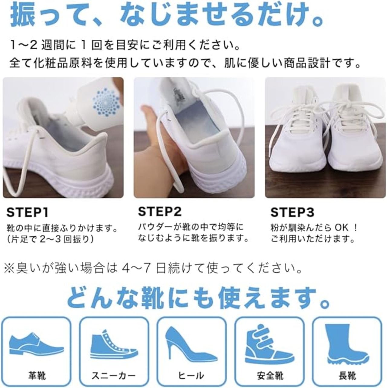 【天然成分が本気の消臭力】天然鉱物、亜鉛・チタンを微粒粉砕使い心地にこだわりました。快適性、サラサラ感を高めるためにトウモロコシ由来原料を配合。タイムチモールが、除菌・抗菌・消臭ベタつき、匂いを抑えサラサラ感を実現しました。他の足デオドラント製品にない。パウダータイプならではの感動的な消臭効果を体験して下さい。
