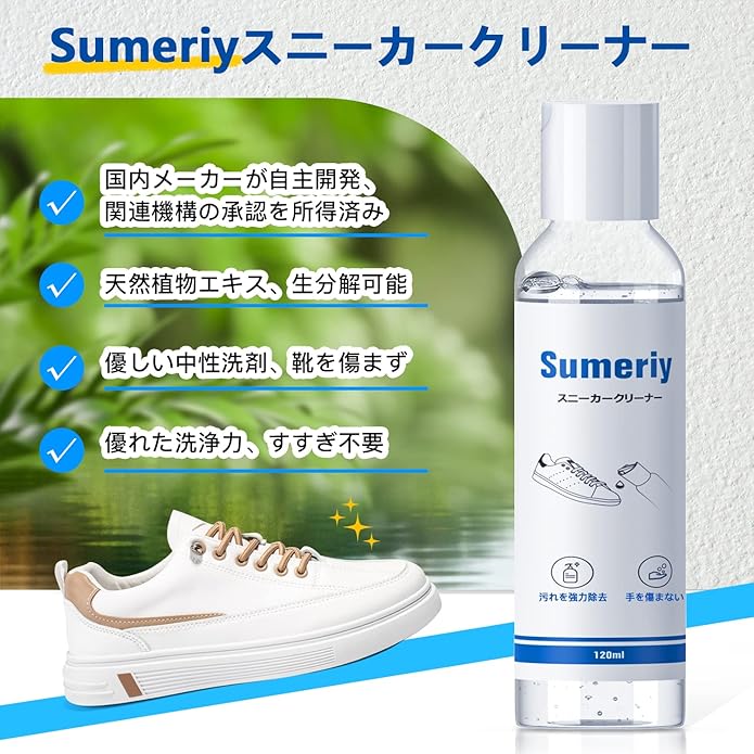 [Sumeriy] スニーカークリーナー 靴用洗剤 天然植物エキス配合 すすぎ不要 強力洗浄 各種素材に適用 靴クリーニングセット 120mL