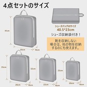 【便利な5点セット内容】XLサイズ(41 10 20cm):ジャケットやパンツなどの大型衣類に最適;Lサイズ(35 10 26cm):シャツやセーターなどの一般的な衣類にぴったり;Mサイズ(32 10 22cm):日常の衣類や小物類の収納におすすめ;Sサイズ(25 10 20cm):下着やアクセサリーなどの小物収納に最適;シューズバッグ(40.5 23cm):靴の持ち運びに便利な専用袋。靴以外の小物収納にも使えます。
