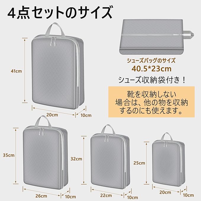 旅行用圧縮袋 トラベルポーチ 便利旅行圧縮バッグ 4点セット シューズバッグ付き 可変スペース 圧縮で衣類スペース 衣類仕分け収納 スペース節約 スーツケース 軽量 出張 旅行 温泉 海外 修学旅行 便利グッズ (グレー)