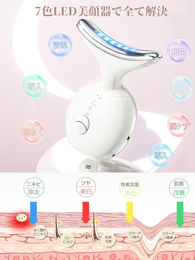 【7色光エステ・肌も心も輝かせる】日々の忙しさに追われ、鏡の中の自分と向き合うひと時が減っていませんか?毎日たった3分のケアで、気がつけば本来の美しさを取り戻します。この美顔器は、●7種類光●高周波振動汚れ落とし、●3段恒温浸透、●EMSリフトケアという多彩な機能を持ち、サロンのような贅沢なケアを自宅で叶え、心も肌も優しく癒します。自分を大切にすることで、日々の活力が生まれ、大切な人への贈り物としても、相手の笑顔と共に心も温かく満たされるでしょう。美しさは、分かち合うことでさらに深く、さらに輝きます。