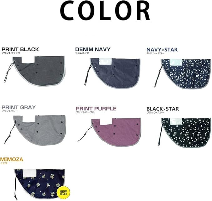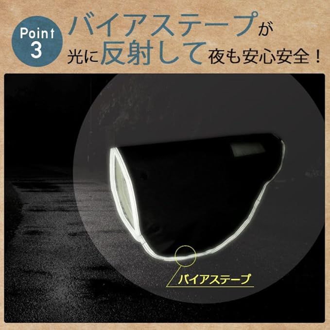 ・ハンドルカバーとハンドルの固定はスナップボタンと紐を使うのでしっかりと固定が行えます。 ・反射バイアステープは薄暗い雨の日や夜道の車のライトを反射し存在感をアピールできる安心の仕様!
