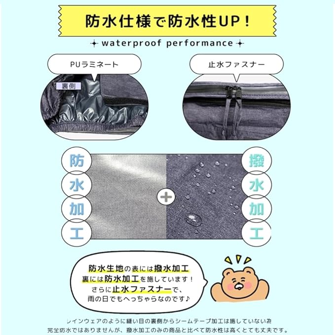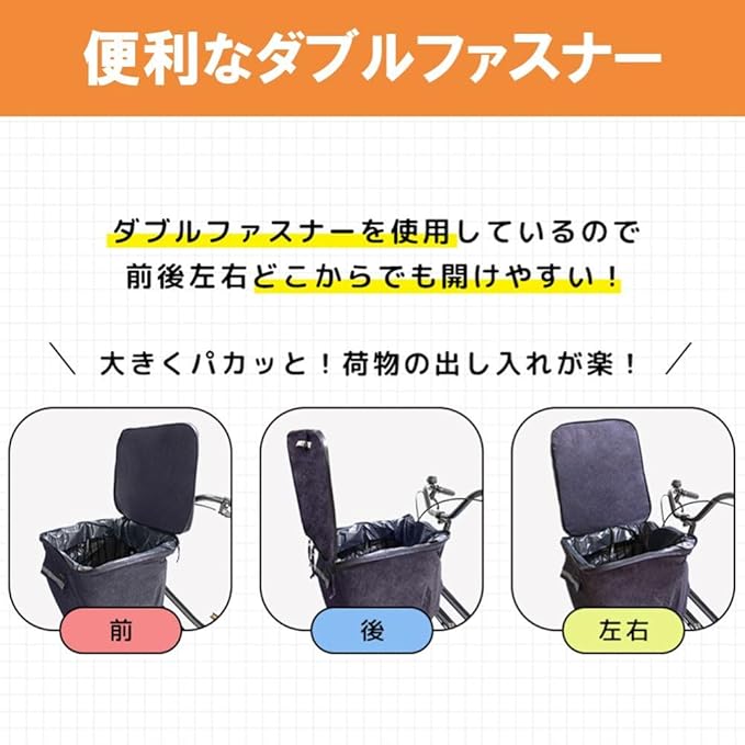 【生地】撥水防水生地・防水&撥水加工で防水性アップ!! 【ダブルファスナー】ダブルファスナー使用で前後から開閉可能!自転車の運転席側からも自転車の前からも大きく開いて出し入れしやすい。