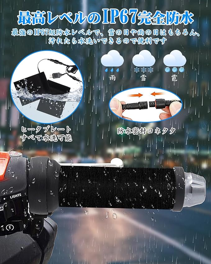 【IP67完全防水&丸洗い可能】グリップヒーター バイク用 巻き付け式の防水レベルはIP67に達し、極端な場合でもスイッチとカバーを水に浸すことで正常に動作し、さまざまな悪天候条件下での使用を確実に保障します。ハンドルカバーを清潔にする必要がある場合は、プラグを簡単に抜くだけで、水洗いができるので便利です。注意:できるだけクランプヒーターを乾燥させてください。湿った状態では、水は熱を奪い、温度感を下げる。悪天候の場合は、USBポートが濡れて故障しないようにしてください。