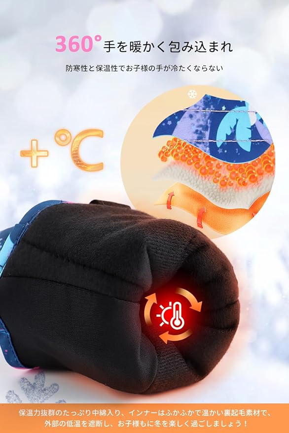 【撥水透湿性】手袋の表面に撥水材質が加工されていて、雪や風を徹底ガードし、手の乾燥を保ちます。スキーグローブは手首が伸縮性ゴム付いて、冷たい風の入りを防ぎ、もっとウォーマーになリます。可愛いデザインを設計されて、男の子、女の子に大人気!色鮮やかで可愛いデザインで目を惹かせて、、冬の外遊びが楽しみになる子様用にぴったりなグローブです。