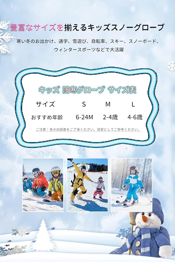 【冬に活躍する子供手袋】サイズ:S:6ヶ月~2歳、M: 2歳~4歳、L :4歳~6歳。 通園通学の冬の防寒やスキー・スノーボード ・雪遊びなどのウィンタースポーツに幅広くお使って頂けます!カラーとサイズ展開も豊富なので、お子様の手に合ったグローブが見つかりましょう!
