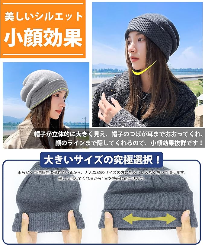 【肌に優しい・大きいサイズの究極選択!】適応頭囲範囲は55〜64cmです。帽子の伸縮性を改良したため、頭が大きい方でも長時間着用しても痛みを感じず、自然に頭にフィットします。さらに、締め付け感がなく、大きい頭囲の方にとっての究極の選択です!エコ素材生地で肌に優しく、肌が弱い方に肌刺激が大幅軽減されます。手洗いで洗濯も可能で、汗をいっぱいいかいても安心です。また、優れた吸放湿性に、天然系防臭効果がプラスで、秋冬にも、清潔すっきりかぶれます。