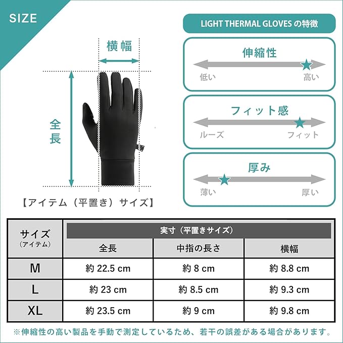 【蒸れにくい吸湿速乾性素材でいつでも快適】 吸湿速乾性素材を使用し、手袋内の湿気を素早く外に逃がす独自の放湿機能を搭載。運動中や長時間の使用でも蒸れにくく、常にサラッとした快適な着用感をキープします。汗をかきやすいランニングやサイクリング、アウトドア活動でも快適に過ごせるよう設計されていて、スキーグローブなど、厚手グローブのインナーとしても快適に使用できます。軽量で通気性に優れたこのグローブは、さまざまなシーンで心地よい着用感を提供します。
