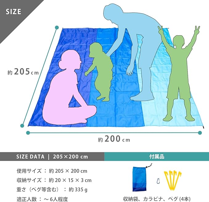 【サイズ/付属品】展開時のサイズは約205 200cmで、収納時は約20 15 4cm。パッケージには、[レジャーシート1枚]、[ペグ4本]、[カラビナ1個]、[収納袋1個]が含まれていて、重さは付属品もすべて含めて約335gと超軽量です。ペグの長さは約15cmです。