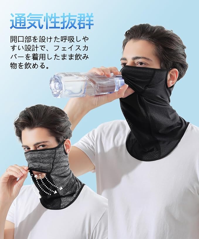 【開口部を設けた呼吸しやすい設計】フェイスカバーは開口部を設けます。「息苦しくなく・飲み物がそのまま飲める・メガネがくもりにくい」という3つの特徴のある2部式構造で、会話はもちろん、作業する時やスポーツでも息苦しさを感じにくいです。吐いた息が自然に下に抜けるので、メガネやサングラスが曇りにくい構造になります。自転車やランニングなどのスポーツにフェイスカバーを着用したまま飲み物を飲めるので、夏の便利な紫外線対策アイテムです。