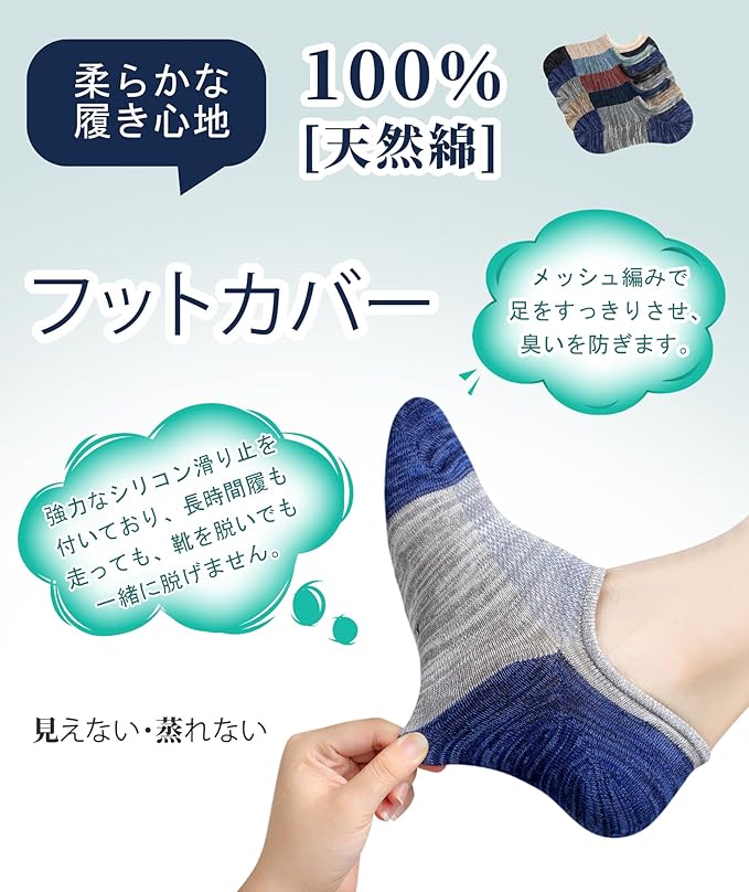 【吸汗通気防臭】高質な素材を採用したこのフットカバーは、防臭吸汗加工をされて、有効的に匂いを抑えられます。足に蒸れを防いで、除臭に優れてます。