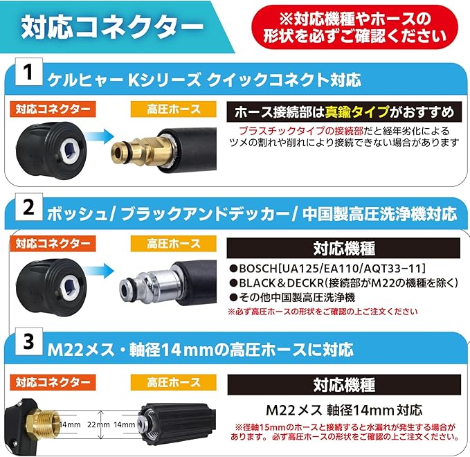 【ケルヒャー対応ショートガン】高圧洗浄ショートガンは、ケルヒャーKシリーズの「クイックコネクトホース」に対応。ケルヒャー高圧洗浄機 Karcher K(ケルヒャー Kシリーズ)/ MINI /K2 /K3 /K4/ K5 /K6/ K7(サイレント・クラシックの両方に対応)、 Japanet JTK と接続が可能です。(注:ケルヒャークイックコネクト採用前の古い機種には接続不可。OC3、KHB5、業務用HDシリーズは接続不可)。また、M22-14mmめねじジョイントのホースに直接接続できます。(Generac、Simpson、Briggs Stratton、Craftsman、Karcher、Ryobi圧力洗浄機などのM22-14mmホースを備えた圧力洗浄機と互換性があります。)