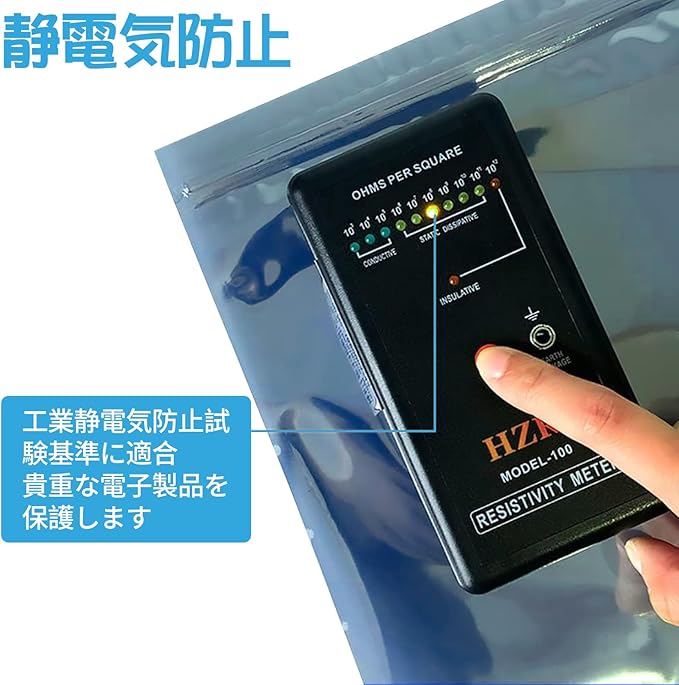 【材質】この帯電防止袋はポリエチレンテレフタレート(PET)から作られ、壊れにくく、無毒で異臭がなく、表面の金属化膜は良好な帯電防止効果があり、安心して使用することができる。